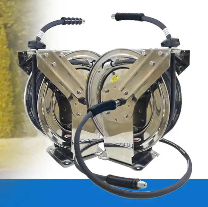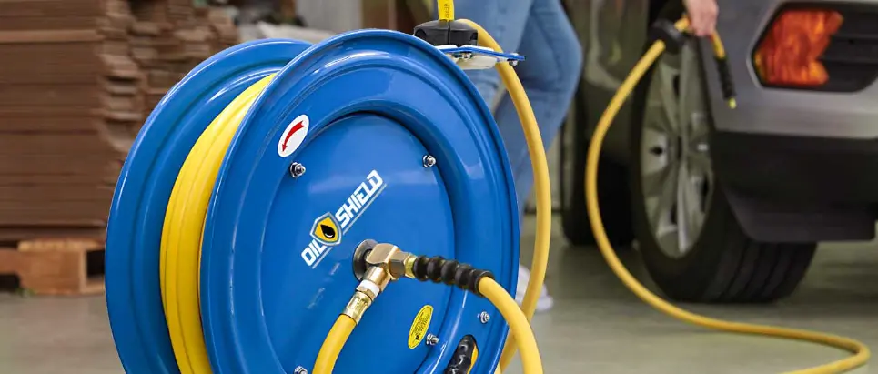 OilShield heavy duty air hose reel is an ultimate combination of 18 gauge heavy duty steel constructed reel & with ribbed edges and the RMA Class A Oil Resistant air hose . Our air hose reel ensures strength, durability and operator safety! it provides stability and reliability in any environment. This combo is perfect for Automotive & DIY Industry. It is a great cost-effective alternative to motor driven reels.