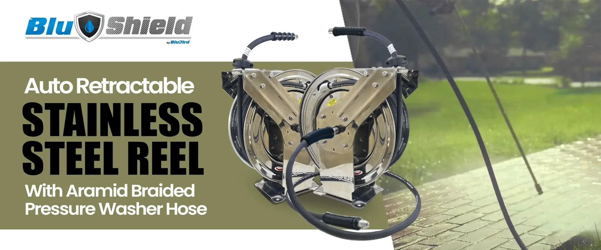 BluShield Rubber Pressure Washer Hose with RMA Class A oil resistant tube, Non-conductive Kevlar/Aramid braiding helps eliminates the risk of electrical shock. Much more flexible than wire-braid & double wire braid Pressure Washer Hoses.
