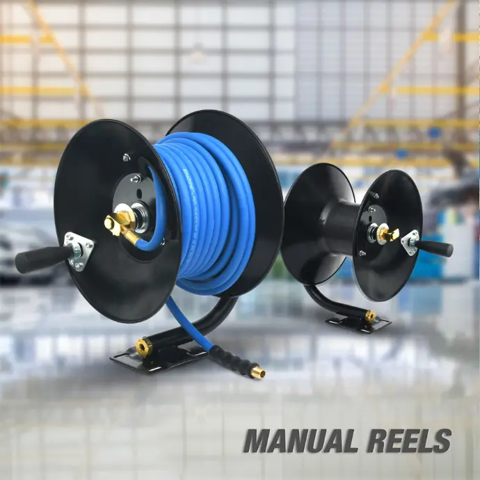 OilShield heavy duty air hose reel is an ultimate combination of 18 gauge heavy duty steel constructed reel & with ribbed edges and the RMA Class A Oil Resistant air hose . Our air hose reel ensures strength, durability and operator safety! it provides stability and reliability in any environment. This combo is perfect for Automotive & DIY Industry. It is a great cost-effective alternative to motor driven reels.